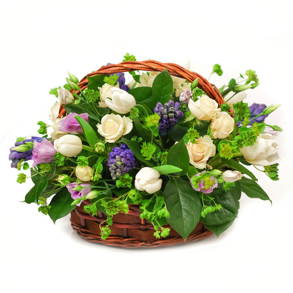 Роза кустовая, тюльпан, гиацинт, буплерум, эустома, салал.