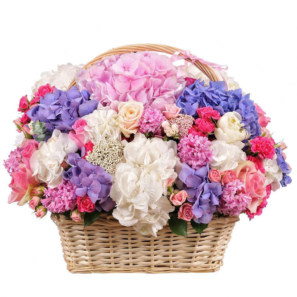Гортензия микс, роза микс, пион, гиацинт, озотамнус.